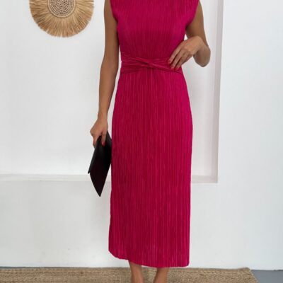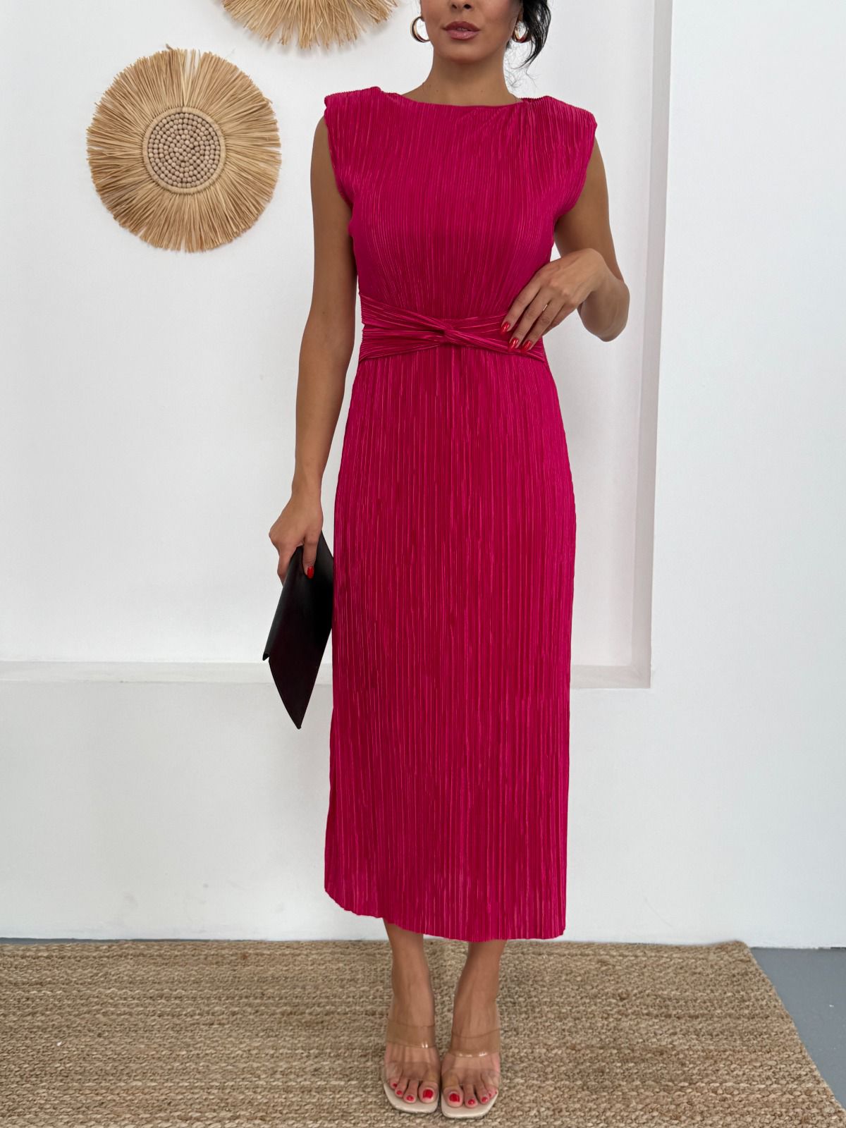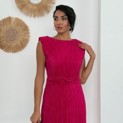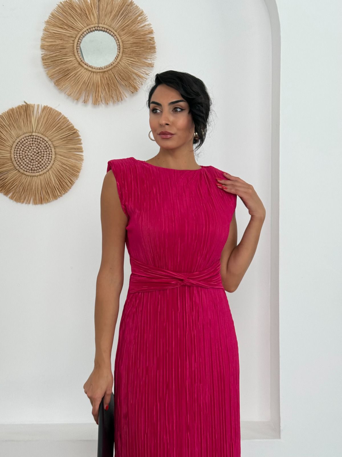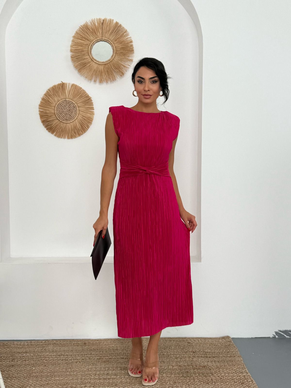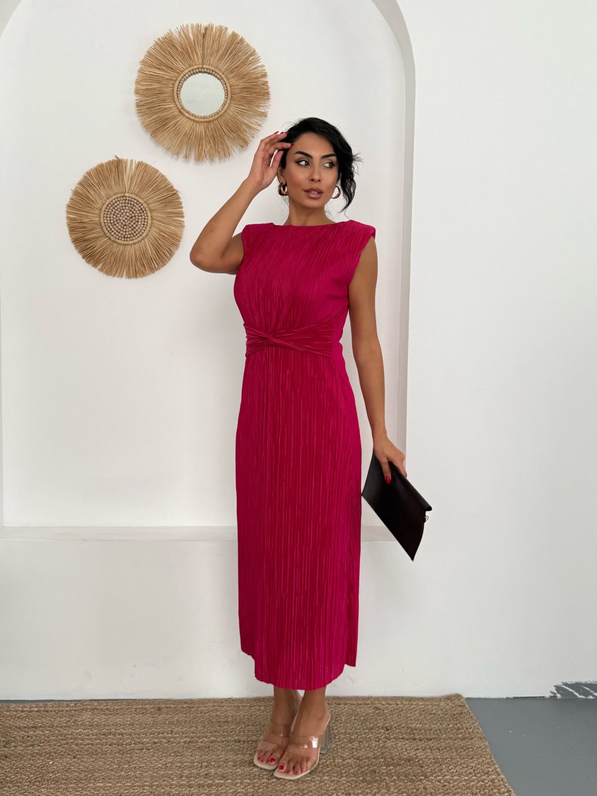 Fuşya pliseli midi elbise, fuşya midi elbise, pliseli kadın elbise, şık elbise, yazlık elbise, günlük elbise, zarif elbise, modern kadın giyim, midi elbise modelleri, trend elbise